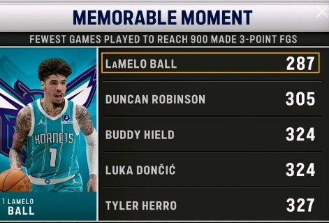 转播方晒出一组数据,NBA历史上投进生涯前900记三分所用场数最少的球员榜单如下: